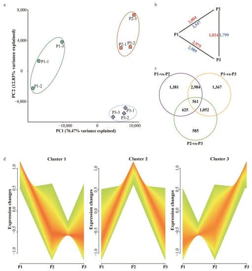 Principal component analysis (PCA) and hierarchical clustering dendrogram of the nine RNA sequencing libraries obtained from tissues collected at three development stages of the “Dapao” variety of iron walnut with three biological replicates for each. (a) Principal components one and two (PC1 and PC2) could explain 76.47% and 12.83% of the variance in the transcriptome samples. (b) The number of up- and down-regulated genes between the three different developmental stages of walnut. (c) Venn diagrams of the shared and unique genes among three compared pairs (P1 vs. P2, P1 vs. P3, P2 vs. P3). (d) Cluster dendrogram of the DEGs among three different developmental stages. P1: the endocarp of “Dapao” walnut at 60 DAA, P2: the endocarp of “Dapao” walnut at 90 DAA, P3: the endocarp of “Dapao” walnut at 120 DAA.