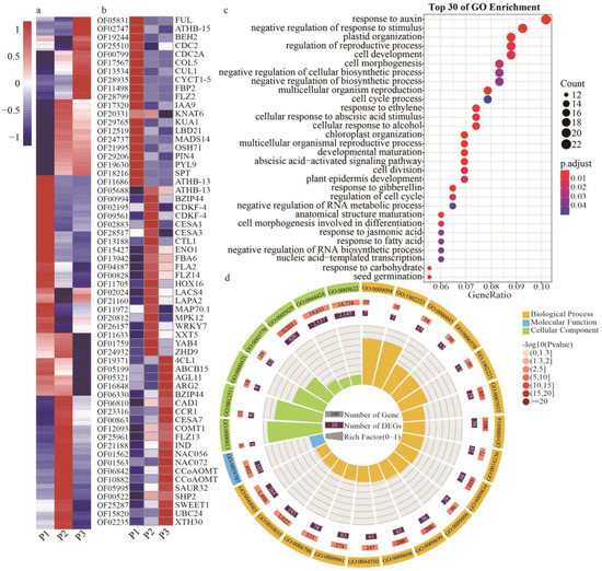 Analyses of gene expression patterns in developing shells of iron walnut “Dapao.” (a) The gene expression trends at three iron walnut shell developmental stages. Gene expression changes are expressed as log2-fold change (y-axis), and developmental stages are identified on the x-axis. (b) The gene expression trends of essential DEGs during three walnut shell developmental stages. (c) Enriched GO annotation of DEGs involved in the early developmental stage of walnut shells. (d) Enriched GO annotation of DEGs involved in the late developmental stage of walnut shells. P1: the endocarp of “Dapao” walnut at 60 DAA, P2: the endocarp of “Dapao” walnut at 90 DAA, P3: the endocarp of “Dapao” walnut at 120 DAA.