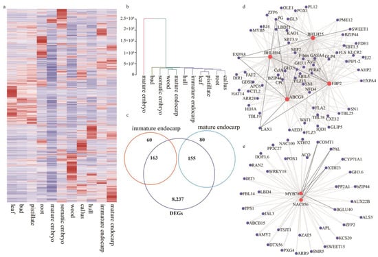 Identification of essential DEGs controlling walnut shell development. (a) Heatmap representation of transcription levels of tissue-specific genes across eleven different tissues (leaf, bud, pistillate, root, somatic embryo, mature embryo, wood, callus, hull, immature endocarp, and mature endocarp tissues). (b) Hierarchical clustering tree of all eleven tissues based on the gene transcript levels. (c) Venn diagrams of the shared and unique genes among immature endocarp, mature endocarp, and DEGs. (d) Predicted transcriptional regulatory network in the immature endocarp. The network is composed of essential TFs and their target genes. (e) Predicted transcriptional regulatory network in the mature endocarp. The central TFs related to immature and mature endocarp development are represented in red, and their target genes are represented in blue.