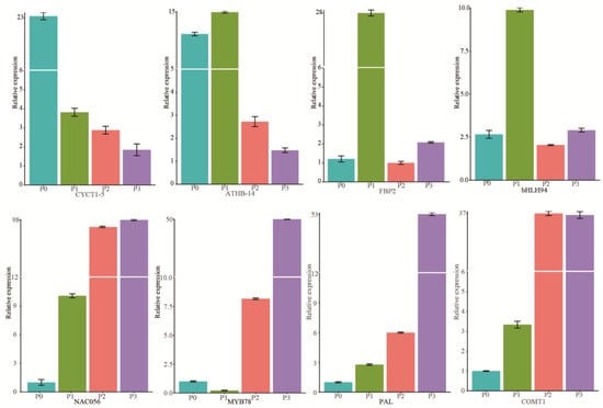 Validation of transcriptomic data using qRT-PCR. The x-axis represents the different stages of “Dapao” walnut shell development at 30, 60, 90, and 120 DAA. The y-axis represents the gene expression level, which is the 2−∆∆ct value of qRT-PCR compared to the reference gene. Data are the means of three replicants. Error bars indicate SDs. P0: the endocarp of “Dapao” walnut at 30 DAA, P1: the endocarp of “Dapao” walnut at 60 DAA, P2: the endocarp of “Dapao” walnut at 90 DAA, P3: the endocarp of “Dapao” walnut at 120 DAA.