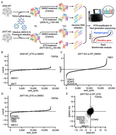 2.5. Genome-Wide CRISPR Screens Identified ZATT as a Critical Gene for ETO Sensitivity