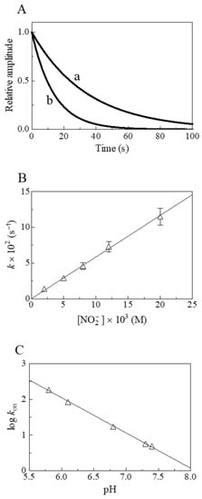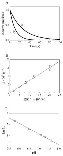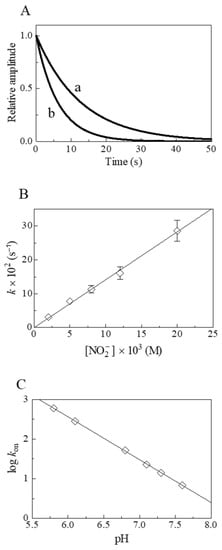 Nitrite reductase activity of Hs-Nb(II) at 20.0 °C. (A) Normalized averaged time courses for the NO2−-mediated conversion of Hs-Nb(II) to Hs-Nb(II)-NO at pH 7.3 in the presence of 5.0 × 10−3 M (trace a) and 1.2 × 10−2 M (trace b) NO2−. The time course analysis according to Equation (3) allowed the determination of the following values of kobs: 2.9 × 10−2 s−1 (trace a) and 7.3 × 10−2 s−1 (trace b). (B) Dependence of kobs on the NO2− concentration for Hs-Nb(II) nitrosylation at pH 7.3. The solid line was calculated according to Equation (4) using kon = 5.8 ± 0.6 M−1 s−1. (C) pH-dependence of log kon for the NO2−-mediated conversion of Hs-Nb(II)-NO. The value of the slope of the continuous line is −0.99 ± 0.10. Where not shown, standard deviation is smaller than the symbol.