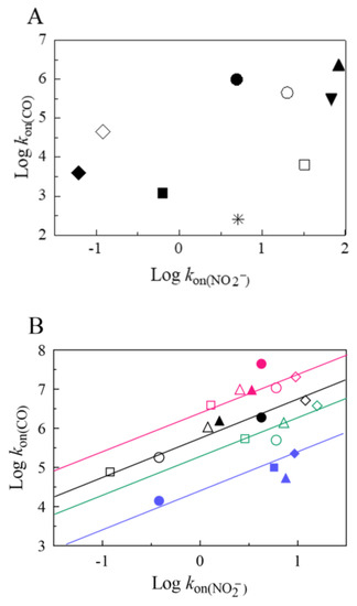 In order to have an overall view of the nitrite reductase activity of heme proteins and of their structural determinants, a list of heme proteins has been reported in Table 1. As a starting point, the second-order rate constant of the nitrite reductase activity of the heme proteins was compared to that of CO binding, which is usually considered as a probe of the energetic barriers (both on the distal and proximal side) for the reactivity of the heme–Fe(II) atom. Moreover, the coordination of the metal center in the ferrous form, which should be of some help in finding out the main determinants of the reactivity, has been reported. For the sake of consistency, only the values of the bimolecular rate constants for CO binding obtained by the rapid-mixing technique, which only can be employed for measurement of the nitrite reductase activity, have been reported. Accordingly, the values of the bimolecular rate constant for CO binding reported in Table 1, which were only obtained by flash and laser photolysis, such as for ferrous six-coordinated plant Hbs (i.e., Synechocystis Hb (S-Hb(II)), rice nonsymbiotic Hb(II) class 1, and Arabidopsis thaliana Hb (At-Hb(II) class 1 and class 2), have been calculated according to Equation (1) (see also footnotes to Table 1):