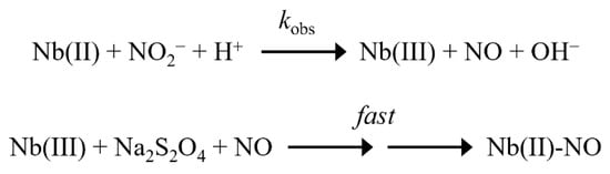 The values of the apparent second-order rate constant for NO2− reduction by Mt-Nb(II), At-Nb(II), Dr-Nb(II), and Hs-Nb(II) (i.e., kon) were determined from the linear dependence of kobs on the NO2− concentration (i.e., [NO2−]), according to Equation (4) [27,28,29,30,32,36,40,41,42,44,45,46,47]: