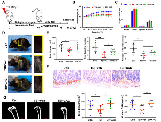 To further examine the effect of CAG on aging organs, we selected the small intestine and bone, which exhibit high sensitivity to TBI-induced aging [23,24]. As shown in Figure 4F, TBI induced a decrease in the number of GLR5-positive cells in the intestinal crypts, suggesting radiation-induced exhaustion of stem cells in the intestinal crypts. However, CAG treatment increased the expression of GLR5 in the intestinal crypts compared with vehicle treatment. In addition, micro-CT analysis showed that TBI also induced 3D bone mineral density (BMD) decrease in the femur, which was reversed by CAG treatment. The total average bone mineral density was 431.6 mg/cm3 in the CAG group and 394.5 mg/cm3 in the TBI group (Figure 4G). Taken together, these data demonstrate that CAG improved the age-related symptoms and organ aging in TBI-aged mice.