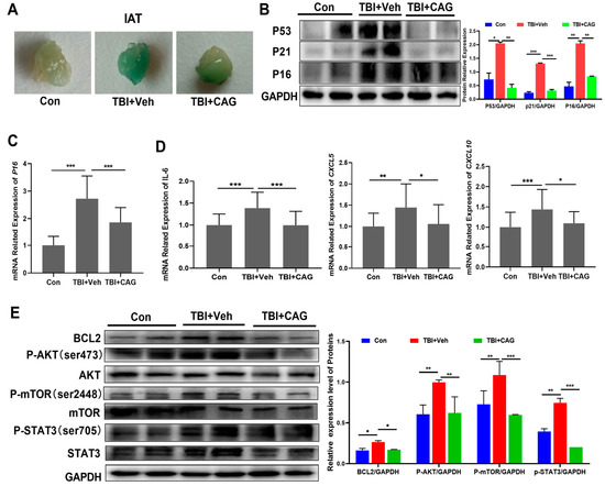 To determine whether the delay of age-related symptoms in CAG-treated mice coincided with a reduction in the number of SCs in tissues, we first collected samples of inguinal adipose tissue (IAT) and analyzed the number of SCs using SA-β-gal staining. As shown in Figure 5A, the IAT of TBI-aged mice stained strongly for SA-β-Gal, while CAG-treated mice showed a marked decrease in SA-β-Gal staining. In addition, senescence markers including P53, P21, and P16 were significantly elevated in the liver of TBI-aged mice compared to age-matched control mice. Treatment with CAG resulted in a significant reduction in the protein expression levels of senescence markers, as well as in the mRNA expression of p16 (Figure 5B,C). Similarly, CAG treatment also decreased the mRNA expression of SASP factors including IL-6, CXCL-5, and CXCL-10 in liver tissues compared with the vehicle group (Figure 5D).