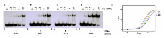 We explored possible differences in E2 binding affinity for its four E2 binding sites in a quantitative manner by EMSA. In this quantitative analysis, E2 protein was titrated in increasing amounts to labeled oligonucleotides containing E2 binding sites 1–4 (Figure 3). We could not go to a high enough concentration (e.g., 10 × Kd) due to the possibility of E2 precipitation in low salt conditions of EMSA, and thus all Kd values reported here should be taken as “apparent Kd.” Free and bound DNA quantities were determined using Phosphor Imager and ImageQuant TL software. The percentage of bound DNA for each binding site was plotted using GraphPad Prism 5.0 (Figure 3e). The apparent binding affinities were determined using non-linear regression analysis of the plots (% bound vs. log [E2]). The apparent dissociation constants (KD) were computed using a variable slope sigmoidal dose–response model in PRISM 5.0 software, and these values are shown in Table 1. These experiments were carried out in triplicate and averaged. The highest binding affinity was observed for binding site 4 (BS4), with a KD of 4.8 ± 0.7 nM (Figure 3d). Intermediate binding affinity was observed with binding site 1 (BS1) and binding site 2 (BS2), with KD of 6.2 ± 0.9 nM and 7.8 ± 0.7 nM, respectively (Figure 3a,b). Slightly lower binding affinity was observed with binding site 3 (BS3), corresponding to a KD of 10.2 ± 1.7 nM (Figure 3c). With GST-E2 fusion protein, Thain et al. [16] found similar DNA binding patterns but with much higher Kd values, possibly due to the GST-fusion. Moskaluk and Bastia identified the binding sites of E2 using the DNA-binding domain [44]. Mok et al. [45] demonstrated DNA binding to E2BS sequences by the DNA binding domain of E2, but the Kd values were substantially higher than that reported here with the full-length protein. They also reported precipitation of the domain at lower ionic strength buffer, similar to that reported here.