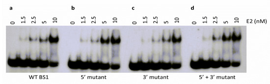 Regardless of the sequence, E2 was able to form a DNA-protein complex with each oligonucleotide (Figure 6). When the BS1 5′s flanking sequence was replaced with the BS3 5′ flanking sequence (5′ mutant), the binding constants remained unaffected and were 6.0 ± 0.7 nM and 6.4 ± 0.6 nM, respectively (Figure 6a,b). However, the replacement of the BS1 3′ flanking sequence with that of BS3 (3′ mutant) led to a slightly higher KD of 7.6 ± 0.6 nM (Figure 6c, Table 1). The double mutant (5′ + 3′ mutant) with both the 5′ and 3′ flanking sequences from BS3 bound with a KD of 7.7 ± 1.7 nM (Figure 6d, Table 1). Together, our data suggested that the flanking sequences had a small but clear effect on E2 binding.