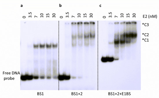 E2 BS1 and BS2 are in close proximity in all HPV origins and are separated by a few nucleotides. Some previous studies have supported E2 DNA binding cooperativity, while others have disagreed on its involvement [46,47,48,49]. Oligonucleotides contained either one E2 binding site (BS1), or two E2 binding sites (BS1+2). The third probe (BS1+2+E1BS) used in the EMSA was generated by PCR amplification of the HPV-11 upstream regulatory region spanning HPV-11 genome nucleotide 7092-7933/1-92. This oligonucleotide incorporated BS1, BS2, and E1 binding site (E1BS). By EMSA analysis, a single E2-DNA complex (C1) was observed with one binding site and yielded a KD of 5.3 ± 0.6 nM (Figure 8a), as expected. The incubation of E2 with an oligonucleotide containing two binding sites (BS1+2) resulted in a higher binding affinity of 4.2 ± 0.3 nM (Figure 8b). Notably, with the addition of this second binding site, higher-order complex formation was also observed (C2) (Figure 8b). In addition, as the formation of higher-order complexes increased, the appearance of the lower-order complexes concomitantly decreased. This pattern is more visibly evident in the oligonucleotide containing two E2 binding sites as well as an E1 binding site (BS1+2+E1BS), which was more representative of the HPV-11 origin (Figure 8c). Experiments with BS1+2 and BS1+2+E1BS yielded similar binding patterns as well as binding affinities. Together, our data suggested that the DNA binding activity of E2 may have a cooperative DNA binding component. In other words, E2 binding to the first site led to more efficient binding to the other nearby sites, as indicated by enhanced binding affinity. Understandably, the higher order complex was seen only with E2 binding to two E2 binding sites (oligonucleotides BS1+2 and BS1+2+E1BS), or two E2 dimers binding on the DNA. Another apparent feature, observed only when two E2 binding sites are present, is the formation of a third complex (C3), indicative of a much larger, multimeric E2-DNA complex indicating possible recruitment of other E2 dimers to the complex.