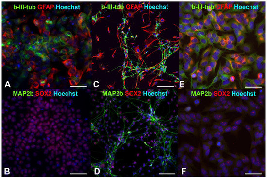 Fluorescent immunocytochemistry of human neural progenitor cells (drNPCs) and human neuroblastoma cells (SK-N-BE (2)): (A,B) Phenotype of human drNPC in proliferation medium; (C,D) neuronal and glial differentiation of human drNPCs induced by growth factors (positive control); (E,F) immunophenotype of human neuroblastoma cells (SK-N-BE (2)). Cells were stained with cocktails of primary antibodies (mouse monoclonal + rabbit polyclonal), followed by staining a cocktail of goat anti-mouse and goat anti-rabbit secondary antibodies with Alexa Fluor 488 (green channel) and Alexa Fluor 633 (red channel), respectively. The cell nuclei were stained with Hoechst (blue channel) in all the images. Scale bar 100 µm for (A–D) and 50 µm for (E,F).