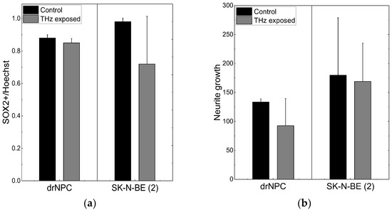 No significant reduction of the number of SOX2-positive stem-like cells due to the THz irradiation was observed in either the non-tumor or tumor cell cultures (p < 0.05), and no changes in the morphology cells were found, and no mature MAP2b+ appeared. In addition, no signs of differentiation were observed in the cultures of the neural progenitor cells and neuroblastoma cells after the THz irradiation (Figure 2b). Thus, no effect of THz radiation on the differentiation of drNPC and human neuroblastoma cells (SK-N-BE (2)) was revealed.
