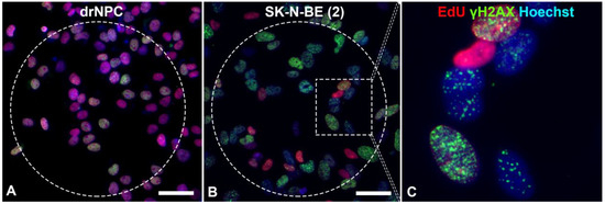 The level of histone H2AX phosphorylation may remain normal in aging cells and in cells undergoing the natural cell death pathway—apoptosis. During the S phase of the cell cycle, active replication takes place, which requires the decondensed state of chromatin and leads to its increased amount, which proportionally increases the number of the γH2AX foci [39]. Therefore, we performed an estimation of the number of foci of histone phosphorylation in cells, which were not in the synthesis phase of the cell cycle. To identify cells in the S phase of the cell cycle, 5-ethynyl-2′-deoxyuridine (EdU) was applied to the DNA structure. The analyses revealed that most of the human neuronal stem-like cells were in the S phase of the cell cycle, which reflected a high proliferative activity of these cell types (Figure 3).