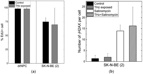 The number of human drNPC in the S phase was essentially higher than that of SK-N-BE (2), both in the parallel control group (~75%), and in the experimental group (~70%) after the THz irradiation (Figure 4a). However, while the proliferation of human drNPC after THz remains stable, the proliferation of neuroblastoma cells (SK-N-BE (2)) after irradiation decreases (~5%), though this decrease is not statistically significant. Thus, one may conclude that strong non-ionizing terahertz radiation does not affect the proliferative activity of either non-tumor or tumor cells.