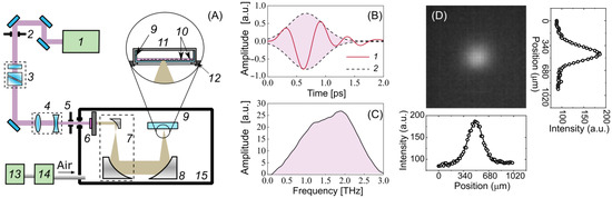 Experimental setup for cell irradiation. (A) Schematic: 1—femtosecond laser, 2, 5—iris diaphragm, 3—polarization attenuator, 4—lens telescope, 6—OH1 crystal with a filter, 7—mirror telescope, 8—focusing mirror, 9—Petri dish, 10—cells, 11—heated plate and cover, 12—3-axis linear stage, 13—adsorption desiccant, 14—air compressor, 15—dry box. (B) Waveform of the THz pulse: 1—THz waveform, 2—Gaussian envelope; (C) spectrum of the THz pulse; (D) spatial distribution of THz radiation.