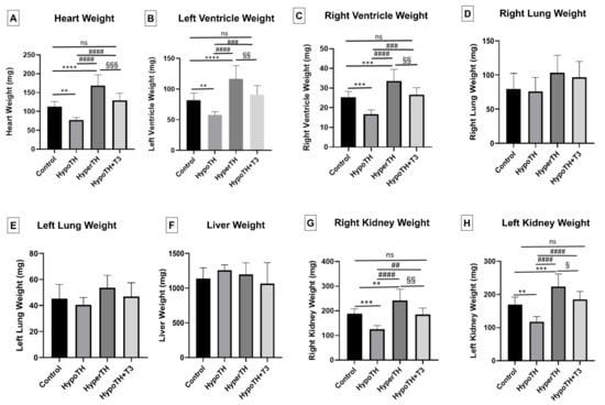 Morphometrics under altered TH states (all mice): Alterations in (A) Heart, (B) Left Ventricle, (C) Right Ventricle, (D) Right Lung, (E) Left Lung, (F) Liver, (G) Right Kidney, (H) Left Kidney weights of mixed sex mice when subjected to HypoTH, HyperTH, and restoration in the HypoTH group following oral T3. All values are means ± standard deviation; n = 8–10 per group. TH–thyroid hormone; HyperTH: Hyperthyroidism; HypoTH: Hypothyroidism; T3: Triiodothyronine; ** p < 0.01, *** p < 0.001, **** p < 0.0001 vs. controls; ## p < 0.01, ### p < 0.001, #### p < 0.0001 vs. HypoTH; § p < 0.05, §§ p < 0.01, §§§ p < 0.001 vs. HyperTH; ns: not significant.