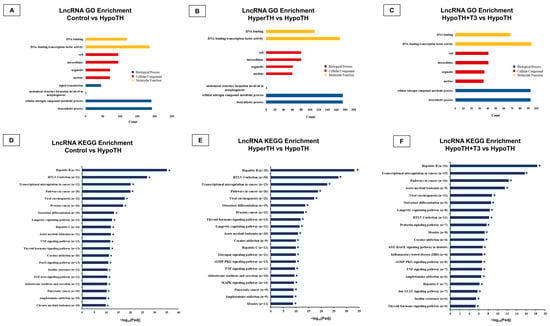 GO and KEGG analyses of lncRNAs revealed significant enrichment: Significantly enriched (A–C) GO terms (p < 0.05) in (A) Control vs. HypoTH, (B) HyperTH vs. HypoTH and (C) HypoTH + T3 vs. HypoTH groups and (D–F) Top 20 KEGG pathways associated with differentially expressed genes compared with background in (D) Control vs. HypoTH, (E) HyperTH vs. HypoTH and (F) HypoTH + T3 vs. HypoTH groups. Statistically significant KEGG enrichments are marked with asterisks; GO: Gene Ontology; KEGG: Kyoto Encyclopedia of Genes and Genomes; HyperTH: Hyperthyroidism; HypoTH: Hypothyroidism; T3: Triiodothyronine; p-adj—adjusted/corrected; * p < 0.05.
