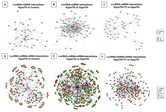 LncRNA-miRNA and lncRNA-miRNA-mRNA correlation analyses. Three groupwise comparisons identified the (A–C) lncRNA-miRNA and (D–F) lncRNA-miRNA-mRNA partners. (A,D) HypoTH vs. Control; (B,E) HyperTH vs. HypoTH; (C,F) HypoTH + T3 vs. HypoTH. The interaction network images were prepared in Cytoscape. Only statistically significant (p-adj/corr < 0.05) and differentially expressed lncRNA, miRNA and mRNA targets were included in this network analysis. Upregulated targets are marked in red and downregulated targets are marked in green.