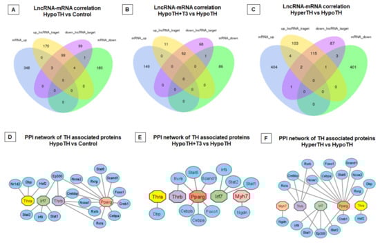 LncRNA-mRNA correlation Analysis and PPI network. (A–C) LncRNA-mRNA correlation analysis. Groupwise comparisons identified the LncRNA-mRNA partners in (A) HypoTH vs. Control, (B) HypoTH + T3 vs. HypoTH, and (C) HyperTH vs. HypoTH groups. Only statistically significant (p-adj < 0.05) and differentially expressed lncRNA and mRNA targets were included in this correlation analysis. (D–F) Protein–protein interaction (PPI) network for genes co-expressed with significantly altered lncRNAs and critically involved in cardiac or TH pathways in (D) HypoTH vs. Control, (E) HypoTH + T3 vs. HypoTH, and (F) HyperTH vs. HypoTH groups. The interactions that showed p < 0.05 were included in this analysis.