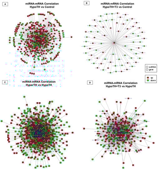 miRNA-mRNA correlation analysis. Groupwise comparisons identified the miRNA-mRNApartners in (A) HypoTH vs. Control, (B) HypoTH + T3 vs. Control, (C) HyperTH vs. HypoTH, (D) HypoTH + T3 vs. HypoTH groups. The interaction network images were prepared in Cytoscape. Only statistically significant (p-adj/corr < 0.05) and differentially expressed miRNA and mRNA targets were included in this network analysis. Upregulated targets are marked in red and downregulated targets are marked in green.