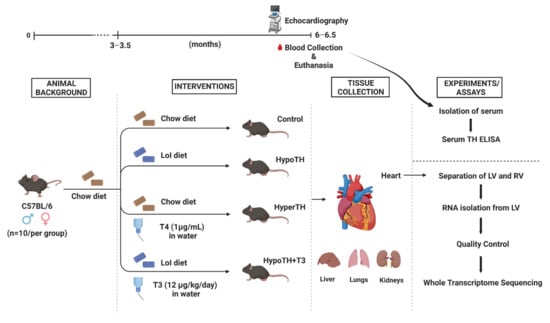Experimental protocol design leading to WTS: Complete protocol and timeline is presented for the animal experiments in this study (the image was created with biorender.com). LoI: Low iodine; HypoTH: Hypothyroidism; HyperTH: Hyperthyroidism; TH: Thyroid hormone; T3: Triiodothyronine; T4: Thyroxine; LV—Left Ventricle; RV—Right Ventricle; ELISA—Enzyme-linked immune sorbent assay; WTS—Whole Transcriptome Sequencing.