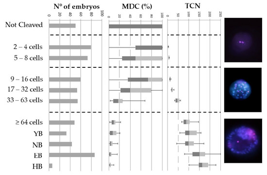 Prevalence of membrane-damaged cells (MDCs) and total cell number (TCN) in bovine embryos, at day 8 post-fertilization. Embryos were cultured individually in droplets of 20 µL albumin-free culture medium and at day 8, a morphological evaluation of the blastocyst stage was performed using a stereomicroscope. Subsequently, all non-fixed viable embryos were subjected to Hoechst/propidium iodide staining to assess the TCN and the percentage of MDC. The boxplots show the median values (transition dark grey–light grey), 25th and 75th percentile (boxes), and 5th and 95th percentile (whiskers). All embryos (n = 606) were collected from four replicates, the number of embryos belonging to a developmental stage (YB = young blastocyst; NB = normal blastocyst; EB = expanded blastocyst; HB = hatching or hatched blastocyst) is represented in the figure.