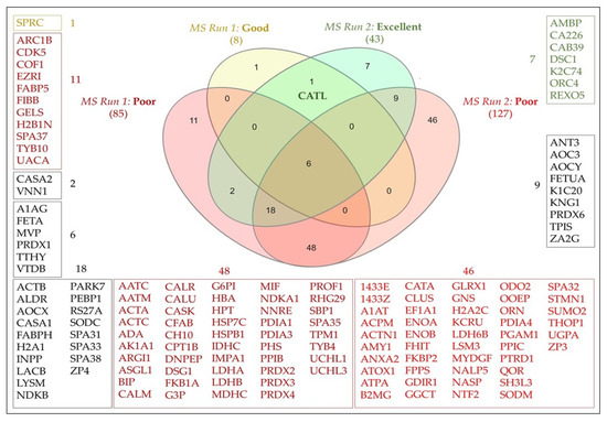 Venn diagram depicting all protein accessions identified in the compared media after subtraction of the proteins in the blank medium. Compared media: ‘MS Run 1: Good and Poor’: pooled medium conditioned by good- and poor-quality embryos, respectively; ‘MS Run 2: Excellent and Poor’: pooled medium conditioned by excellent- and poor-quality embryos, respectively. Numbers from the Venn diagram are depicted with their respective Uniprot accession numbers in the periphery. Protein descriptions can be found in Supplementary Tables S1 and S2. Cathepsin-L (CATL) was the only protein exclusively identified in ‘MS Run 1: Good’ and ‘MS Run 2: Excellent’.
