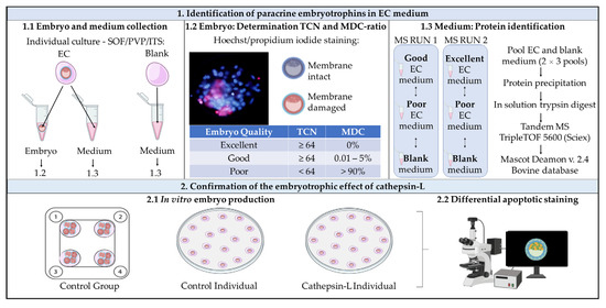 Visual representation of the research described in the present manuscript. 1. Identification of paracrine embryotrophins in embryo-conditioned medium: (1.1) Embryo and medium collection: individual culture of bovine embryos in albumin-free SOF/PVP/ITS medium. Droplets of SOF/PVP/ITS medium without embryo were incubated under the same conditions and served as a blank control. At day 8 post-fertilization, each embryo, droplets of EC medium and droplets of blank medium were collected separately. (1.2) Determination of TCN and MDC ratio: all embryos were subjected to a Hoechst/propidium iodide staining to differentiate between membrane intact and MDCs. Based on the results, embryo quality was categorized as ‘excellent’, ‘good’ or ‘poor’ quality in this context. (1.3) Protein identification: EC medium of good-quality embryos was pooled and compared to pooled EC medium of an equivalent number of poor-quality embryos and an equivalent volume of blank droplets in MS run 1. Under similar conditions, pooled EC medium of excellent-quality embryos, pooled EC medium of poor-quality embryos and blank medium were compared in MS run 2. 2. Confirmation of the embryotrophic effect of cathepsin-L. (2.1) In vitro embryo production: individual culture of bovine embryos in the control medium was compared to individual culture in cathepsin-L-supplemented medium (100 ng/mL). Embryos cultured in a group in the control medium were included as an extra control group. (2.2) Differential apoptotic staining: blastocysts collected at day 8 post-fertilization from exp 2.1 were subjected to differential apoptotic staining. Abbreviations: EC, embryo conditioned; ITS, insulin transferrin selenium; MDC, membrane-damaged cell; MS, mass spectrometry; PVP, polyvinylpyrrolidone; SOF, synthetic oviductal fluid; TCN, total cell number.