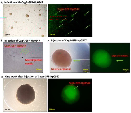 Comparative infection and microinjection of H. pylori into human gastric organoids and traced by green fluorescence protein signaling. (A) CagA-green fluorescence protein (GFP)-labeled H. pylori Hp0547 (CagA-GFP-Hp0547)-infected organoids were cultured for 24 h at a multiplicity of infection (MOI) of 200 and their signals were traced by fluorescence microscopy. Brightfield image (left panel) and their CagA-GFP expressed H. pylori Hp0547 image (right panel) are shown. (B) CagA-GFP-labeled Hp0547 was microinjected as described in Materials and Methods. The microinjection needle is also indicated. (C) Brightfield image of CagA-GFP-labeled Hp0547-infected organoids and their detection of GFP signal by CagA-GFP-Hp0549. (D) Brightfield image and GFP detection of CagA-GFP-Hp0549 after culture for 1 week. Scale bars indicated in each panel. Arrow indicates GFP signal from CagA-GFP Hp0549.