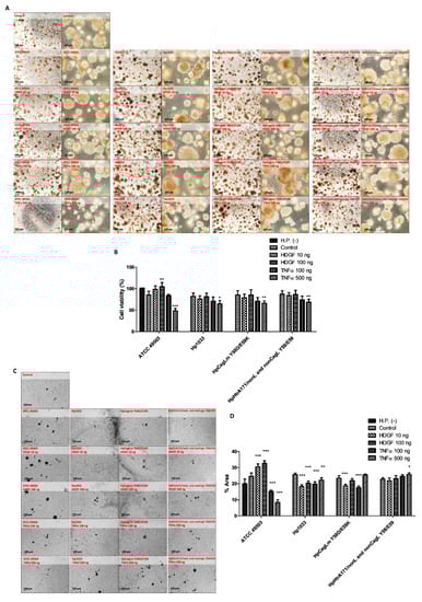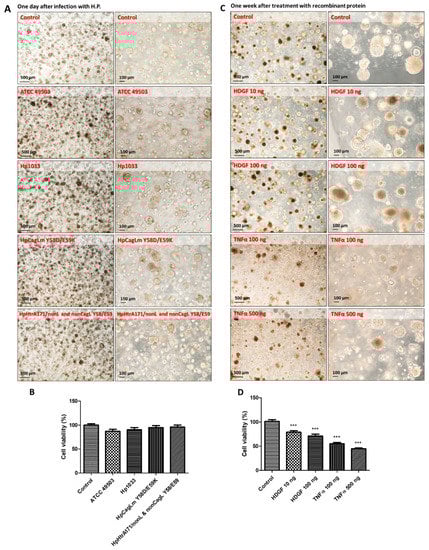 We have used GFP-labeled H. pylori Hp0547 to trace the infection stage to search the entering pathways. In general, it has been reported that H. pylori directly colonizes into the surface of gastric cancer stem cells and adheres to gastric mucosa epithelial cells, and then attaches to superficial cell pits [,]. We found that the GFP signal of GFP-labeled H. pylori 0547 was present in the organoids for at least one week after injection. It might be useful to trace GFP-labeled H. pylori in gastric cancer for therapeutic use (Figure 1). We also compared cell cytotoxicity and growth of three different strains with a different toxicity for oncogenes. However, the cytotoxicity of HCM-BROD-0045-C16 was not affected by these strains of H. pylori (Figure 2A,B). We expected a range of cytotoxic activities of the gastric cancer organoids infected with each H. pylori, from strong infectivity to weak infectivity. However, we found no difference among the strains. The exposure of recombinant proteins of HDGF and TNFα to HCM-BROD-0045-C16 organoids reduced the cell viability of 3-D organoid cells (Figure 2C,D). Interestingly, the cell viability of HCM-BROD-0045-C16 organoids was significantly decreased in a dose-dependent manner. In the case of infection by H. pylori ATCC 40593, recombinant HDGF at high dose (100 ng/mL) increased the cell viability of 3-D organoids (Figure 3A,B). Other strains such as Hp1033, HpCagLm Y58D/59K, and HpHtrA171/nonL and non-CagL Y58/E59 exhibited the cell cytotoxic activities of TNFα (Figure 3A,B).