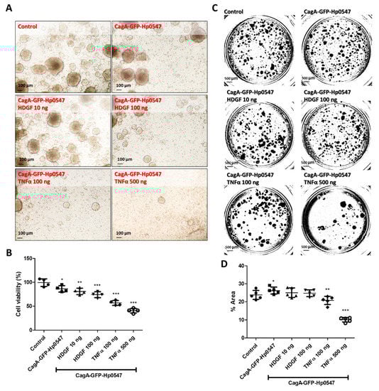 To further confirm this issue, CagA-GFP-labeled H. pylori Hp0547-infected organoid clones were used for cell viabilities and invasion activities in the presence of various recombinant HDGF and TNFα proteins (Figure 4). As shown in Figure 4A, CagA-GFP-labeled H. pylori Hp0547-infected organoid clones were examined for cell viabilities in the presence of various recombinant HDGF and TNFα proteins. In all cases, the recombinant HDGF and TNFα were inhibitory to the growth of 3-D cancer organoids (Figure 4B).