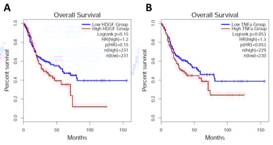 To survey the correlation between the expression of HDGF and TNFα with the clinical outcome, we surveyed the mRNA expression of these genes in 231 patients. As a control, each tumor tissue was paired with neighboring healthy stomach tissues and analyzed based on the Gene Expression Profile Interactive Analysis (GEPPIA2) portal (http://gepia2.cancer-pku.cn/#survival, accessed on 10 May 2019) [] (Figure 5). To characterize the clinical patterns and evaluate the prognostic value of HDGF and TNFα in H. pylori-infected gastric tumors, the data from 231 patients with adrenocortical carcinoma (ACC) or stomach adenocarcinoma (STAD) were normalized by the expression of CagA expression. The baseline characteristics of these tissues were divided into “low” and “high” expression groups for these genes using the survival receiver operating characteristic curve analysis.