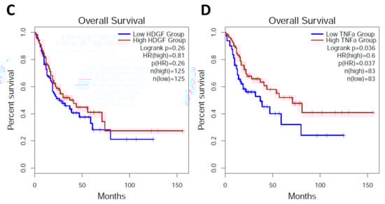 Survival curve of patients with high or lower expressed HDGF or TNFα. A total of 231 patients were surveyed using GEPIA2 (http://gepia2.cancer-pku.cn/#survival, accessed on 10 May 2019) as described in the Methods section; (A,B) are non-normalized by the CagA gene; (C,D) are normalized by the CagA gene.