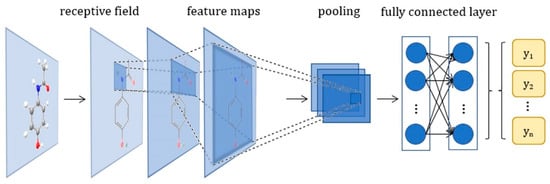 CNNs are a specialized type of NNs that perform convolution in at least one layer []. The first few stages of the CNN have two types of layers: the convolutional layers and the pooling layers (Figure 6). The convolutional layers generate new images called feature maps, and each unit is connected to local patches in the feature map of the previous layer through weights []. The created feature maps are processed through a nonlinearity such as the ReLU activation function. The role of the pooling layer is to reduce the size of the input image, as it merges semantically similar features into one. Typically, a pooling unit computes the maximum of a local patch into one feature map. Different convolution, nonlinearity, and pooling stages are stacked, followed by fully connected layers. CNNs have a large range of applications in image classification, video recognition, and image analysis [,]. CNNs have been used in drug design to improve the performances of the ligand-based virtual screening process [] or the prediction of DTIs []. An efficient variant of CNNs on graphs is a graph convolutional network (GCN). GCNs stack layers of learned first-order spectral filters followed by a nonlinear activation function to learn graph representations []. GCN models are a type of NN that can leverage the graph structure and combine node information from the neighborhoods in a convolutional manner. Ryu et al. [] proposed an attention- and gate-augmented GCN for the prediction of molecular properties. For the same purpose, an edge-attention-based multirelational GCN was developed [].