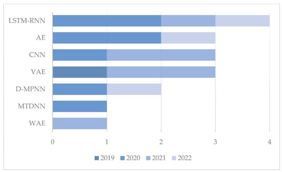 AEs have been widely used in de novo drug design []. The encoder converts the discrete representation of a molecule into a multidimensional continuous representation, and the decoder converts these continuous vectors back to discrete molecular representations. This model allows the exploration of the chemical space through the development of optimized chemical structures. Schultz et al. [] developed a VAE-based software that generated novel antagonists of the NMDA receptor. Data obtained in silico and experimentally were combined to train and refine the model, improving its predictive accuracy. A conditional VAE was employed to develop a new molecular design strategy that generated molecules with the desired target properties []. The AAE is a method that can show good performance in the generation of new compounds while compressing the data to the latent space. An AAE was developed for the identification and generation of new compounds in oncology []. The same group compared the VAE and AAE as a molecular generator model in terms of the reconstruction error and variability of the output molecular fingerprints and published an improved model named druGAN []. Compared with the VAE model, the AAE model showed better capacity and efficiency in generated new molecules with specific anticancer properties.