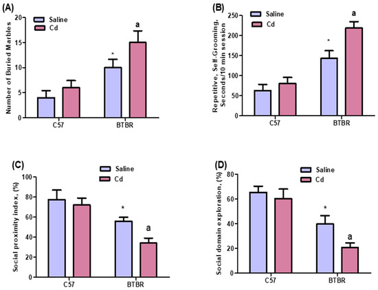 Effects of oral Cd exposure on social behavior in BTBR and C57 mice. Self-grooming (A). Marble burying (B). Social proximity index (C). Social domain (D). BTBR and C57 mice were exposed to Cd (5 mg/kg/day) daily for six weeks. Control C57 and BTBR mice received saline only. All data are shown as mean ± SD (n = 10/group). Different letter indicate significant difference. * p < 0.05 vs. saline-treated C57 mice, ap < 0.05 vs. saline-treated BTBR mice; two-way ANOVA with Tukey’s test.