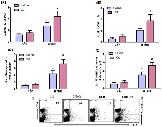 Effects of oral Cd exposure on IL-17A and IL-17F in BTBR and C57 mice. Spleen CD4+ T cells expressing (A) IL-17A and (B) IL-17F. RT-PCR analysis of IL-17A (C) and IL-17F (D) mRNA expression in brain tissue. (E) Representative FSC-SSC dot plots of CD4+IL-17A+ cells were obtained from each mouse spleen. BTBR and C57 mice were administered Cd (5 mg/kg/day) or saline only (control) daily for six weeks. All data are shown as mean ± SD (n = 6/group). Different letter indicate significant difference. * p < 0.05 vs. saline-treated C57 mice, ap < 0.05 vs. saline-treated BTBR mice; two-way ANOVA with Tukey’s test.