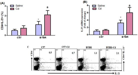Effects of oral Cd exposure on IL-21. (A) IL-21-expressing CD4+ T cells from the spleen. (B) IL-21 mRNA expression in brain tissue. (C) Representative FSC-SSC dot plots of CD4+IL-21+ cells taken from each mouse spleen. BTBR and C57 mice were exposed to Cd (5 mg/kg/day) or saline only (control) daily for six weeks. All data are shown as mean ± SD (n = 6/group). Different letter indicate significant difference. * p < 0.05 vs. saline-treated C57 mice, ap < 0.05 vs. saline-treated BTBR mice; two-way ANOVA with Tukey’s test.