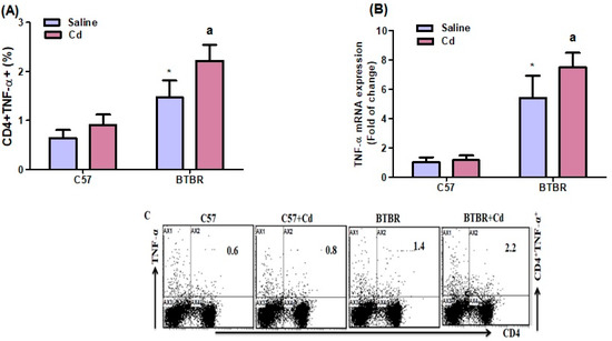 Effects of oral Cd exposure on TNF-α. (A) TNF-α-expressing CD4+ T cells from the spleen. (B) TNF-α mRNA expression in brain tissue. (C) Representative FSC-SSC dot plots of CD4+TNF-α+ cells taken from each mouse spleen. BTBR and C57 mice were orally administered Cd (5 mg/kg/day) or saline (control) daily for six weeks. All data are shown as mean ± SD (n = 6/group). Different letter indicate significant difference. * p < 0.05 vs. saline-treated C57 mice, ap < 0.05 vs. saline-treated BTBR mice; two-way ANOVA with Tukey’s test.