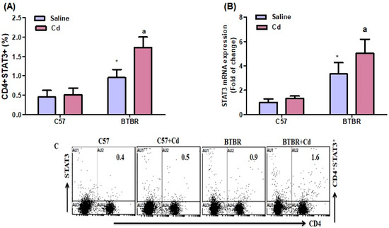 Inhibiting the neuroinflammatory STAT3 signaling pathway [72] decreases abnormal behavior [19]. Enhanced STAT3 expression in the hippocampus has been implicated in neuronal dysfunction [73]. Previously, we reported that STAT3 expression was increased in BTBR mice and children with ASD [11,22,74]. Here, we found that Cd exposure significantly upregulated STAT3 expression in the spleen and brain of BTBR mice, suggesting that the pro-inflammatory effect of Cd exposure is associated with high STAT3 expression, in addition to the involvement of interleukins.