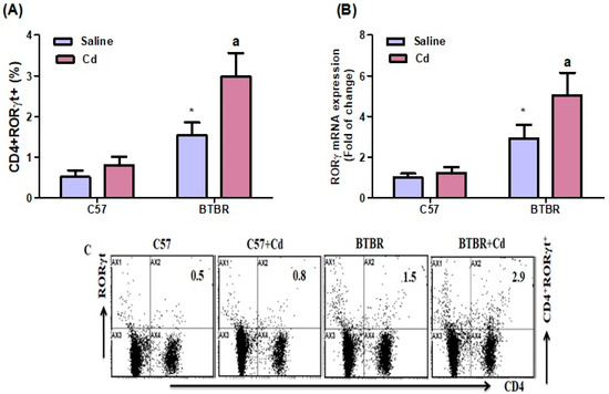 RORγt is critical for mediating many autoimmune diseases [75], and pathogenic CD4+ T cells expressing RORγt contribute to neurobehavioral disorders by triggering brain inflammation [76]. Hence, its suppression has promise as an effective treatment for neuroinflammation [77]. RORγt expression is significantly upregulated in children with ASD and BTBR mice [10,78]. Corroborating these previous findings, we showed that Cd-treated BTBR mice exhibited a significant increase in CD4+RORγt+ T cells. Furthermore, Cd exposure in BTBR mice significantly increased RORγ mRNA levels. Thus, Cd exposure likely worsens neuroinflammation during ASD through the immune imbalance caused by elevated RORγt production. While the similarities between the BTBR mouse model and ASD are well known, it should be noted that there are always limitations in an animal model trying to mimic a human disorder. In ASD, subjects often have co-morbid disorders that are difficult to mimic in BTBR mice. These limitations should be considered while using BTBR mice as a model of autism-like behavior. Further investigations are also necessary to elucidate the role of Cd in modulating Th1/Th22 and T regulatory cells.