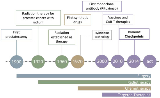 Cancer treatment has been evolving since the beginning of the 20th century. The first and most obvious solution to treat a solid tumor was surgery; however, the therapy has evolved into less invasive, non-surgical treatments focusing on the destruction of tumors by radio and chemotherapy (Figure 5).