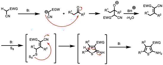 Among NIMCRs, those involving cyanoacetic acid derivatives are extremely versatile, capable of affording chemically diverse scaffolds. NIMCRs usually involve Knoevenagel-type condensations of the cyanoacetic acid derivative with an aldehyde or ketone, followed by a Michael attack of a nucleophile and subsequent ring closure via a second nucleophile attack toward a nitrile. An example is the Gewald reaction (G-3CR) (Figure 4 and Scheme 2), which has recently gained ground with the usage of cyano acetamides. The G-3CR of cyanoacetic acid derivatives, active methylene carbonyls and elemental sulphur is a popular MCR often used in drug discovery yielding 2-amino-3-carbonyl thiophenes. Additionally, Gewald products can be easily transformed into more complex scaffolds by secondary transformations.