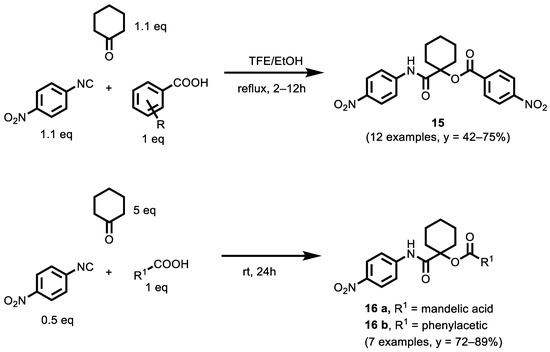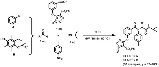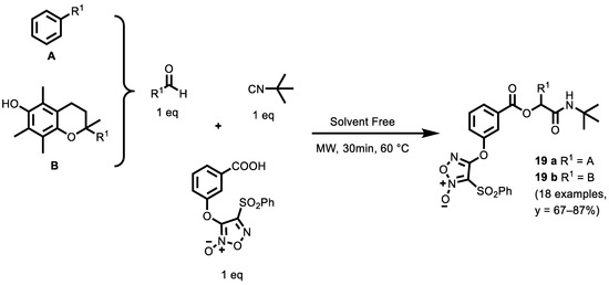 In 2019, Ingold et al. [128] focused their attention on a library of NO-donor compounds through the Ugi Reaction (illustrated in the next paragraph) and the Passerini reaction with optimized yields under green chemistry conditions (Scheme 7). Nitroxyl or furoxanyl groups were incorporated into the carboxylic acid component to evaluate whether the position of the NO-donor moiety plays a fundamental role in the biological activity compared to the previous series and, thus, to explore the chemical space in search of new chemotypes with improved antitumor activity. The use of green solvents, such as water or ethanol, either at room temperature or under microwave irradiation (MW) was productive and it was also observed that the reaction could be performed under solvent-free conditions, using MW irradiation, ultrasound or conventional heating. The authors have selected as our standardized conditions: neat with MW irradiation in a closed vessel for 30 min at 60 °C.