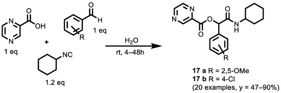 Pyrazine-2-carboxylic acid (PA), due to its heteroaromatic ring, can be explored as an anticancer agent. In a very recent paper [122], a series of twenty novels PA derivatives were synthesized using the Passerini reaction. Their cytotoxic activity was evaluated against three different cancer cell lines, including lung (A549), breast (MCF-7) and colon (HT-29); cisplatin was used as a reference drug. The general synthetic strategy employed to synthesize the PA derivatives was based on the Passerini multicomponent reaction using isocyanide, different aldehyde derivatives and PA (Scheme 5).
