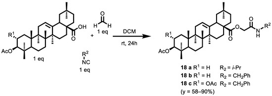 Wiemann and Csuk [127], in addition to the synthesis of the α-acyloxy carboxamides (illustrated in the paragraph above), also synthesized a library of 34 α-acylamino carboxamides from natural triterpene through U-4CR (Scheme 11).