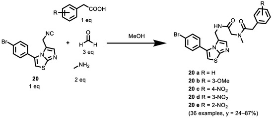In 2021, Griglio et al. [119] synthesized a series of imidazothiazole derivatives based on a compound 14 (IC50 = 77 nM) previously synthesized by Tojo et al. [120], employing the Passerini multicomponent reactions (Scheme 3) and Ugi multicomponent reaction (illustrated in the next paragraph), and studied their inhibitory activities against human Indoleamine 2,3-dioxygenase 1 (rhIDO1). The ability of the selected compounds to inhibit rhIDO1 enzyme activity was determined in an in vitro cell-based assay in order to evaluate their inhibitory effect, together with their ability to permeate the cell membrane. The human melanoma A375 cell line was selected for the cellular assay because it does not express either the rhIDO1 gene or protein under normal culture conditions.