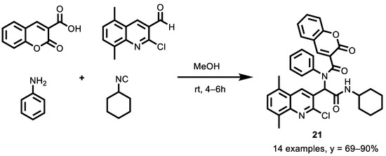 An efficient four-component Ugi synthesis of quinoline-coumarin hybrids was described by Taheri et al. [129]. This simple access to quinoline-coumarin derivatives implicated the use of coumarin-3-carboxylic acid, diverse 2-chloroquinoline-3-carbaldehydes, aniline derivatives and aliphatic isocyanides in methanol at room temperature (Scheme 9).