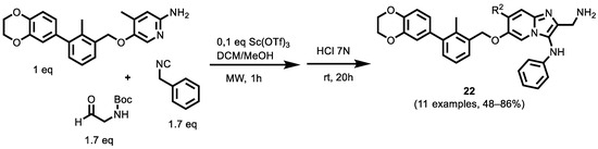 The authors found the optimal reaction conditions for the used substrates in the presence of scandium triflate (10 mol%) as a catalyst, 2:1 DCM/MeOH as the solvent system, a concentration of 0.3 M concerning to the amidine, and 1.7 equivalent of the isocyanide and aldehyde components. Microwave-assisted heating for 1 h generated the corresponding GBB products in good to excellent yields (48–86%) The products were tested for their antiproliferative activity through various biological assays, exhibiting IC50 values of 16.8–1.8 μM (compound 22) at a concentration of 50 μM. These results open the door to an interesting bioactive scaffold that could lead to a new class of PD-L1 antagonists.