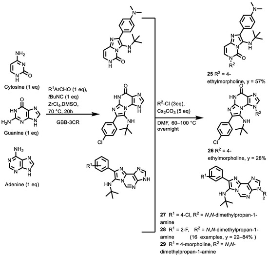 In 2020, for the investigation of new drug-type G-quadruplex selective binders, Pelliccia et al. [131] used the design of nucleobases as a starting point as synthons in a multicomponent reaction. Thus, a series of multifunctional imidazo[2,1-i]purine derivatives were synthesized via a convergent GBB-3CR of amino-aza-heterocycles, benzaldehydes and isocyanide, followed by an SN2 with various aminoalkyl chlorides [R2 = 4-morpholinyl(CH2)2, pyrrolidinyl(CH2)2, Me2N(CH2)3, N-phthalamidyl(CH2)2] (Scheme 12).