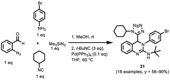 In a very recent publication, Xiong et al. [132] reported the synthesis of 4-tetrazolyl-3,4-dihydroquinazoline derivatives through a sequential Palladium-catalyzed azide-isocyanide cross-coupling/cyclization Ugi reaction, with good yields. The Ugi-azide reactions of various 2-azidobenzaldehydes (R1 = 4-F, 4-Cl, 4-CH3O and 5-Me), amines (R2 = Ph, 4-Cl-Ph, 4-Br-Ph, 4-CH3-Ph, 4-CH3O-Ph, 2-Cl-Ph, 2,4-dimethyl-Ph, n-Bu, i-Pr, t-Bu), trimethylsilyl azide and isocyanides (R3 = t-Bu, c-C6H11, 1-adamantyl, n-Bu) produced azide intermediates that were treated with diverse isocyanides (R4 = t-Bu, c-C6H11, 1-adamantyl, 4-CH3O-Ph, 4-Cl-Ph, MeO2CCH2, TsCH2) to afford compound 18 examples of dihydroquinazoline derivatives (Scheme 14).